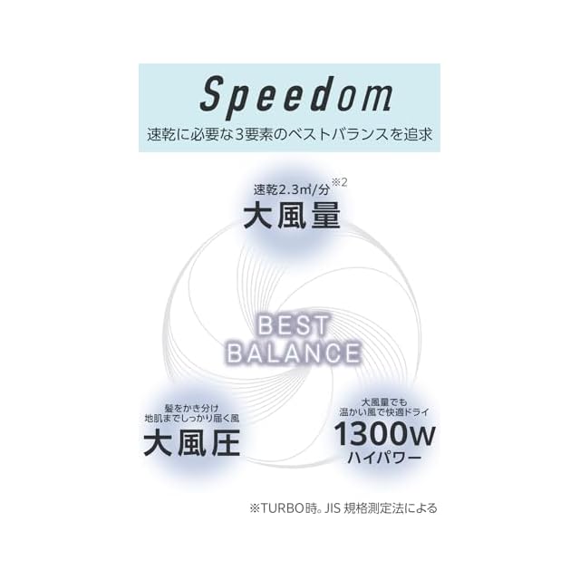 大風量×大風圧×ハイパワーのベストバランスを追及することで、”速乾”を実現しています。