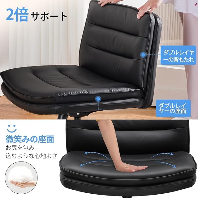 COMHOMA デスクチェア あぐら ソファチェア オフィスチェア ブラック 疲れない椅子 90°~130°ロッキング角度 肘掛けなし 座面広い ホイール付き回転 10cm高さ調節可能 PUレザー 軽快な小型のソファ 一人掛け 小さなスペース (PUレザー, Black-1)