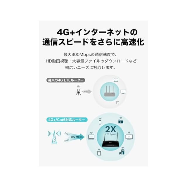 [高速通信を可能にするギガビットポート] ギガビットポートを使用すれば、スマートTV・ゲーム機・NASなどのデバイスに高速接続を提供できます。ケーブル・ファイバー・DSLモデムと互換性のあるWANポートとしてもご使用いただけます。また、WiFiルーターとして設定すれば、3G/4G接続がバックアップとして機能し、有線接続に問題が生じた場合に、自動で3G/4G接続に切り替え、インターネット接続を維持できます。
