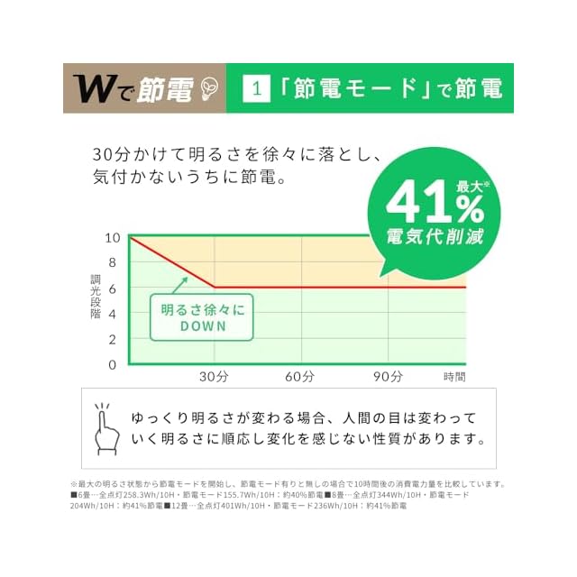 「LED」だから省エネ。明るく効率よく発光。さらに、30分かけて明るさを徐々に落とす「節電モード」を搭載。