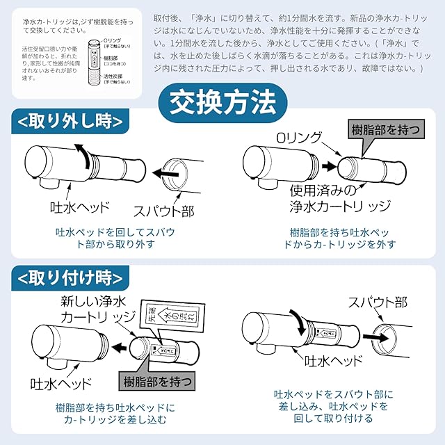 浄水カートリッジ材質:ABS樹脂、活性炭・不織布・中空糸膜・イオン交換繊維。浄水性能:5物質除去,高性能活性炭を使用し、コンパクトさを実現しました。フィルター部に抗菌性があるため、カートリッジ内部で雑菌が繁殖しにくくなります、いつでも安心な浄水をお届けします。