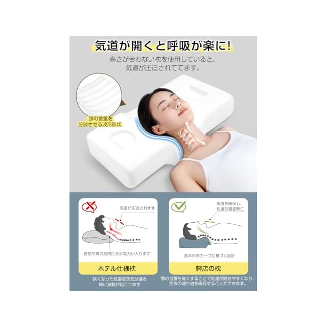 【どんな姿勢でも快適に眠れる低反発枕】 高品質なメモリーフォームを使用しており、 枕に頭を乗せると、頭の形に沿ってウレタンがぐんぐん沈み込んでいき、オーダーメイドのような抜群のフィット感を得られる快眠枕です。 仰向け、横向きなど、どの姿勢にも枕が頭の形に合わせて柔軟に変化し受け止めてくれるので、就寝中の頭部、首、肩への圧力を均等に分散させることで、理想的な寝心地を実現します。