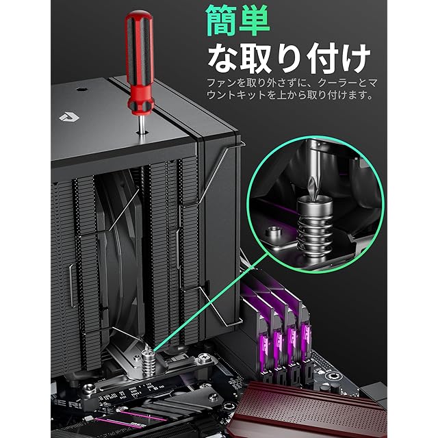 【簡単取り付け】CPUクーラーは新しい設計を採用、冷却ファンを取り外す必要がなく、取り付けが簡単で、時間と労力を大幅に節約できます。ほとんどのマザーボードとファンに対応し、アップグレードとメンテナンスが容易な設計です。幅広いPCケースに対応し、ファンの高さは155mmで、フレキシブルな取り付けオプションが可能です