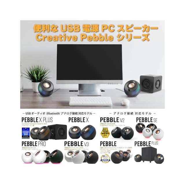 【USB接続・Bluetooth接続・3.5mmプラグケーブル対応モデル】Creative Pebble Proは3種類の音声入力に対応。右スピーカー正面にあるBluetooth/ソースボタンを繰り返して押すことで入力を切り替えます。(今の入力状態はLEDでお知らせします:USBモードは紫色/Auxモードは緑色/Bluetoothは青色で点滅)PCやMacで劣化のないUSBデジタル オーディオを再生したり、Bluetoothワイヤレス接続では、スマートフォンで再生する音楽のワイヤレス オーディオ再生も可能。アナログ接続では携帯ゲーム機やテレビなどのアナログ出力のオーディオも簡単に再生可能
