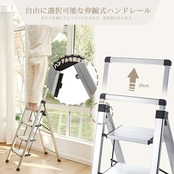 【伸縮式手すりの設計】自由に選択可能な持ち手があって、昇り降りも安心して登ることができます。使用しないときは脚立の手すりを収納可能、隙間に収納して便利です。収納時は厚さ約6.2cmとスリムなサイズ。