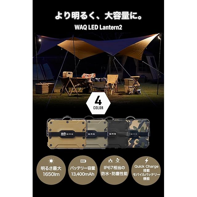 ✔【モバイルバッテリー機能つきLEDランタン】WAQ LEDランタンは最大輝度1650ルーメン・バッテリー容量13400mAhのハイスペックLEDランタンです。ランタンとしては最小クラスのコンパクトさながら、モバイルバッテリー機能付きで停電や災害時の防災にも役立ちます