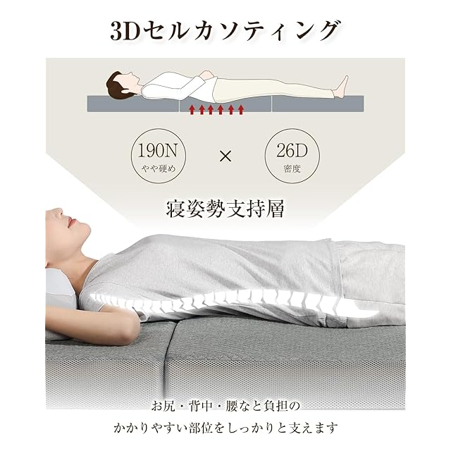 【高反発で寝返りがしやすいの理由】当社のマットレスは、睡眠中の人体の様々な姿勢をシミュレートする10万回の圧力テストを受け、スプリングとフォームの耐久性を保証しています。 マットレスの湿気除去率と空気循環性能を最適化する通気性テストに合格。 年齢も体型も異なる1,000人のユーザーにマットレスを試してもらい、寝心地、サポート力、通気性の評価を含む睡眠のフィードバックを集めました。国際的な睡眠の専門家を製品開発に参加させ、人間工学と健康的な睡眠の観点から改善点を提案しています。 専門家チームは、製品が健康的な睡眠の基準を満たすよう、マットレスのサポート力と寝心地を厳しく評価した。 ユーザーからのフィードバックに基づき、私たちはマットレスの素材比率や構造設計を何度も最適化し、多くの人のニーズを満たす的レスに仕上げています。