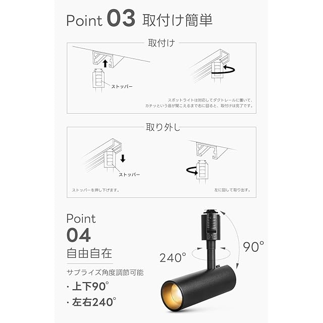 【取り付け簡単 】スポットライトは対応してダクトレールに置いて、カチッという音が聞こえるまで右に回ると、取付けは完了です。ほかのツールは使わずに直接にインストルーが可能です。