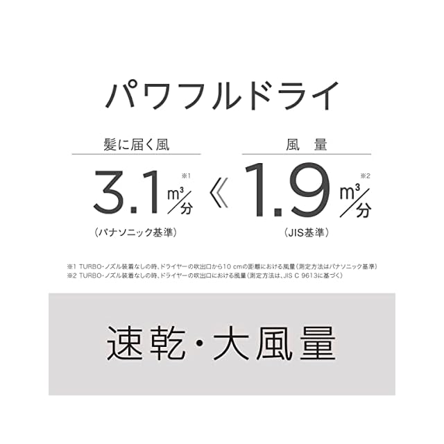 1.9㎥/分(※TURBO・ノズル装着なしの時)自社基準3.1 ㎥/分(※TURBO・ノズル装着なしの時、ドライヤーの吹出口から10 cmの距離における風量。測定方法は自社基準)の大風量で、パワフル乾燥。