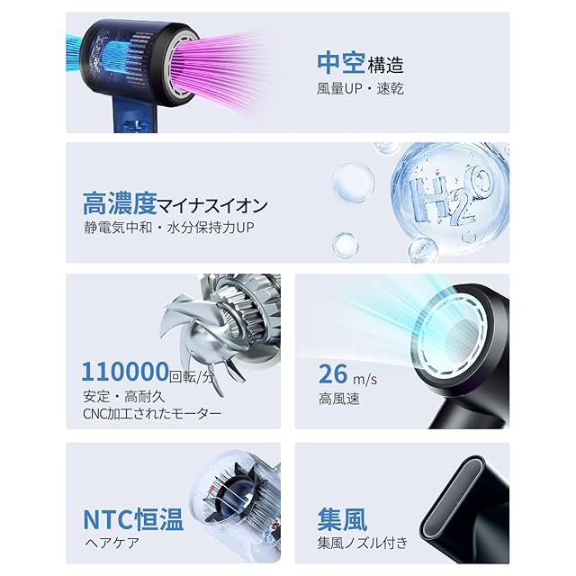 大風量ドライヤー 超軽量 速乾【中空構造・マイナスイオン・冷温風交互】高風速 恒温 ブラシレスモーター11万回転/分 3段階風速 3風温モード 過熱防止 サロン級 家庭用 出張 旅行 持ち運び便利 PSE認証済み 集風ノズル付き(ブラック)