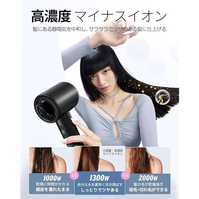 【大風量・速乾】:CNC加工された高品質ブラシレスモーター搭載、吹込み口周りの空気を圧縮して、気流を吹き出します。風量と風圧のバランスを配慮して、驚くほどの26m/s(約)最大風速で、髪を守りながら速く乾かすことができます。乾燥時間を40%以上短くできたので長い髪を早く乾かしたい方に最適です。