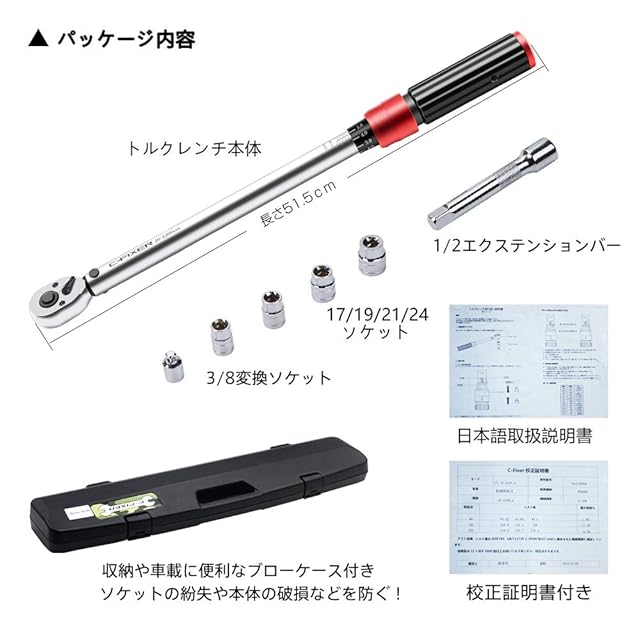 【产品内容】トルクレンチ本体、アルミホイール対応17/19/21/24mmソケット 差込角:12.7mm 1/2インチ エクステンションバー:125mm ★3/8変換ソケット付き ★高級感あるレーシーな仕上げ