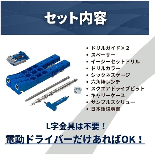 持ち運びに便利なケースの他、ポケットホールジョイント専用のポケットホールスクリューが付属しています。また、日本語の説明書が付属しています。