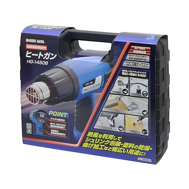 【豊富なノズルアタッチメントで幅広い用途にも対応、持ち運びに便利な収納ケース入】セット内容:本体(HG-1450B)×1、ワイドノズル×1、スポットノズル×1、フックノズル×1、ヘラ型ノズル×1、スクレーパー×1、スクレーパー固定具×1、収納ケース×1、取扱説明書×1