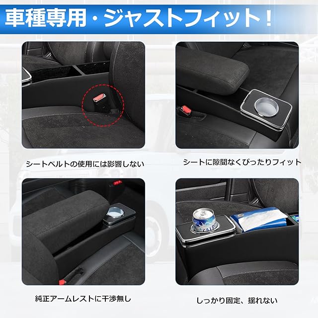 4.【わずか数秒で設置】:フロント席ベンチシートの隙間に挟むだけ取付完了!純正のアームレストにも干渉無し、スッキリ装着できます。純正のアームレストはそのまま使用いただけます。