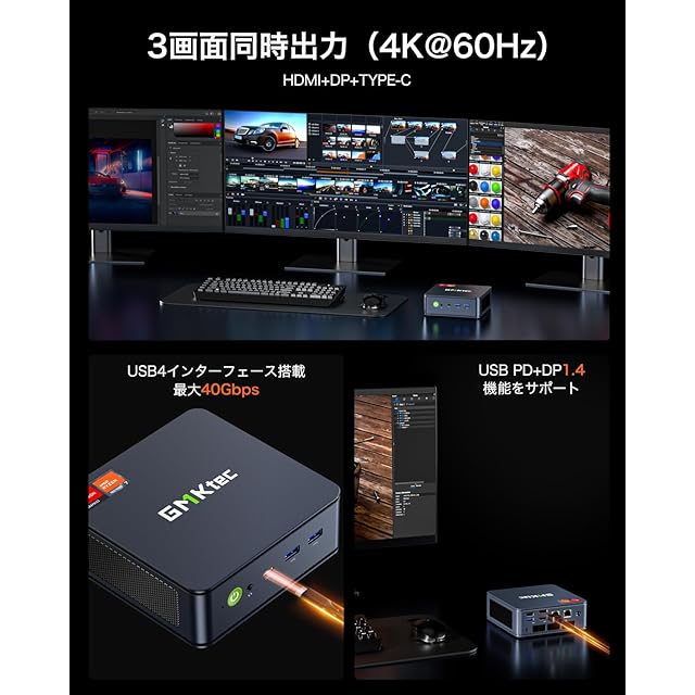 【3画面出力 & 4K高解像度対応】:GMKTEC K6 7840HS ミニ PC は、HDMI 2.0 (最大 4K 60Hz)、Type-C (40Gbps)、DP 1.4 (最大 4K 60Hz) を搭載し 3 台のディスプレイの同時接続をサポートしており、複数のタスクを簡単に実行できます。【最新USB 4.0ポート搭載】USB 4.0ポートは最大40Gbpsのデータ転送速度 をサポートし、8K@60Hzの高解像度ディスプレイ出力に対応。PD 100W入力、15Wの出力給電が可能で、外付けポータブルディスプレイや周辺機器との互換性も抜群。ゲーム、動画編集、プログラミング、映画鑑賞など、幅広い用途に対応します。