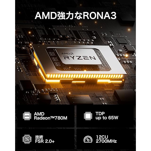 【高性能AMD Radeon 780M グラフィックス】:GMKtec ミニPC K6は、「AMD RONA 3」グラフィックスアーキテクチャで作られたAMD Radeon 780M(12Core 2700MHz)グラフィック処理を搭載しています。 性能は「RONA 2」よりも 23% 高く、完全な N-V-I-D-I-A G-T-X 1650 TI にほぼ近づいています。AMD Ryzen 7 Mini PC 7840HS はデュアル ファン システムで設計されており、迅速に冷却して SSD/DDR をより効率的に実行できます。TDPはBIOSで設定でき、3つのモード(45W、55W、65W)で調整できます。
