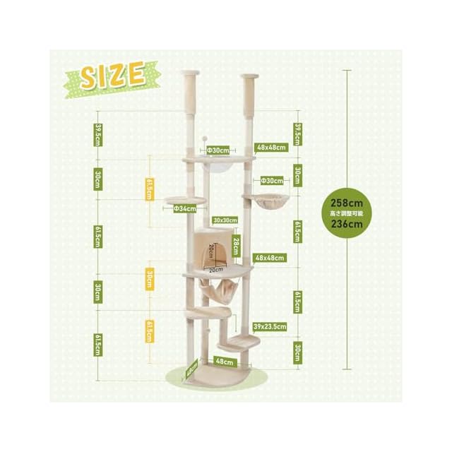 PETEPELA(ぺテぺラ) キャットタワー 突っ張り スリム ツッパリ 猫タワー 省スペース 透明 宇宙船ハンモック おもちゃ 麻紐 爪とぎ 運動不足解消 多頭飼い - ベージュ 高さ調整幅236-258cm