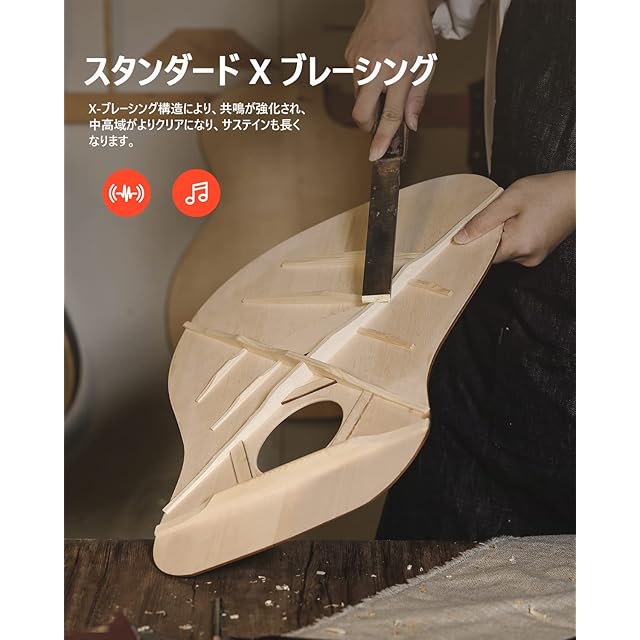 【スプルース材持ち前の美しい音】Donnerフォークギターのトップは上質なスプルース材で作られています。美しい木目だけではなく、スプルースならではの豊かで温かみのあるサウンドをも響かせてくれます。 暖かくバランスの取れた中音とクリアな高音はどんな音楽ジャンルも向いています。