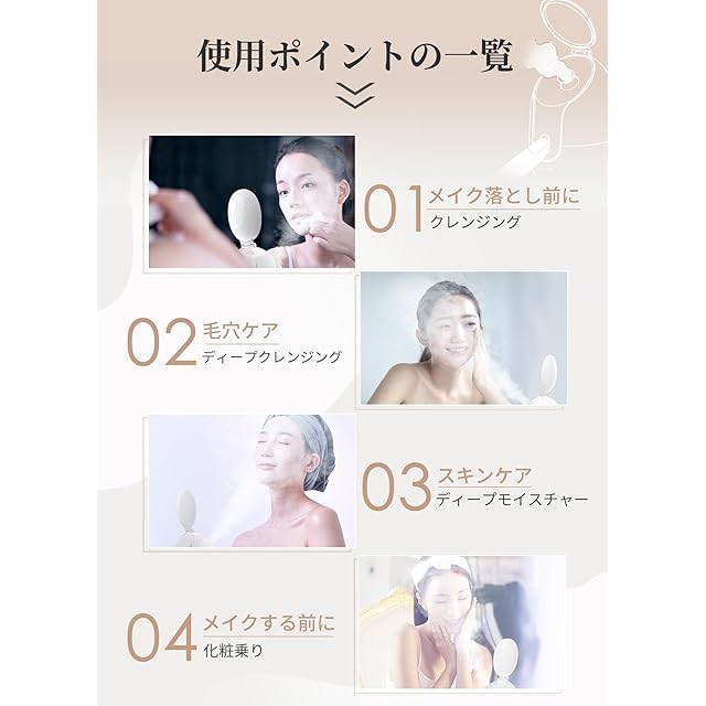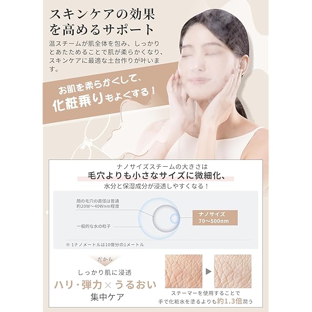 ❤【微粒化技術/ワイド濃密スチーム】ナノは1mmの10億分の1の細かい粒子。普通のスチームと比べて格段にキメが細かいので肌への浸透力も高い!瞬時にナノ化された水分子がお肌の奥にまで届く、毛穴を開くことで詰まった角栓や汚れを落とし、洗浄効果を高め基礎化粧品の浸透率をアップさせてくれる美顔スチーマーです。