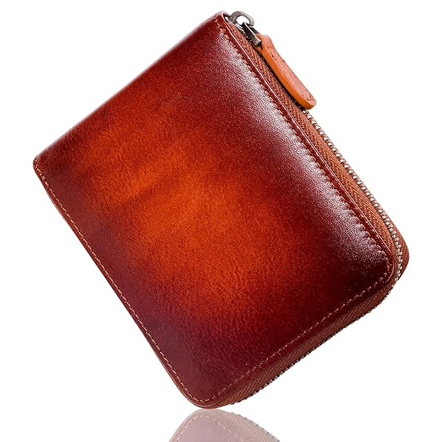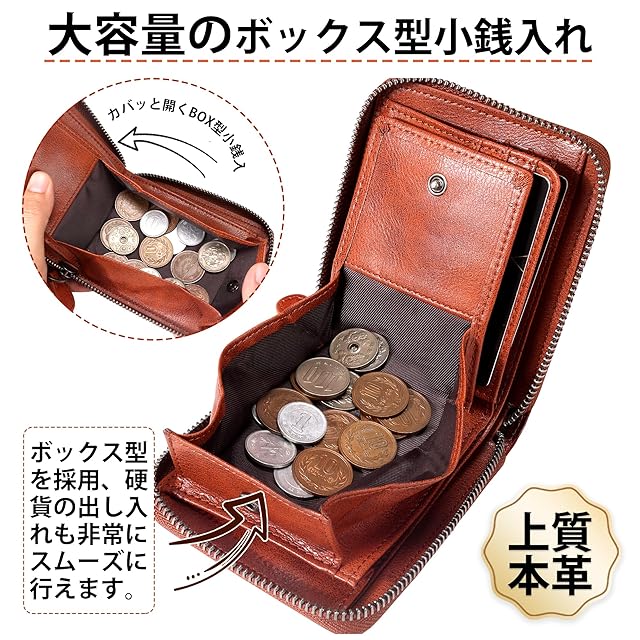 【商品説明 】素材:本革 サイズ : 12.5㎝ × 10㎝ × 2.5㎝、重量:約120g。収納:札入れ×2、BOX型小銭入れ×1、カード入れ×11。