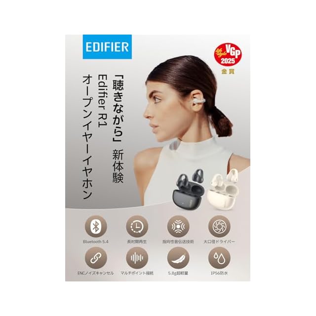 【VGP2025金賞】Edifier R1 オープンイヤーイヤホン bluetooth 5.4 超軽量5.2g ワイヤレスイヤホン ENCノイズキャンセリング 耳を塞がない 寝ホン マイク付き IP56防塵防水/最大28時間再生/急速充電/音漏れ防止/AAC/SBC完全対応/左右自動認識/片耳・両耳使用可能 グレー