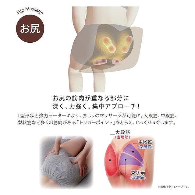 【お尻から肩までこれ一台!しっかり届いてほぐす】お尻:お尻の筋肉が重なる部分に深く、力強く、集中アプローチ 肩:8つのもみ玉の立体的な動きで奥行きのあるもみ心地をお届け 背中・腰:身体をリラックスさせた状態でより密着したマッサージを