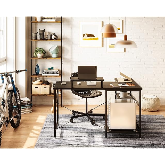 【ラック付きl字デスク】デスクの足元には一体型のラックが備え、本や書類などを使いたい時にサッと取り出せます。たっぷりの収納でデスク周りをスッキリ快適に!また、L字型のデザインで部屋のコーナーを最大限に活用し、ご家庭でもオフィスでも、日常の操作に十分なスペースを確保できます。