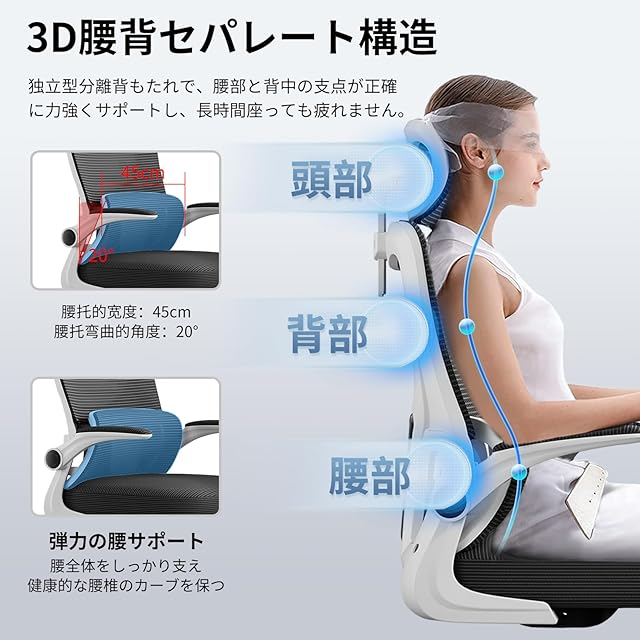 【人間工学で腰背セパレート構造】このオフィスチェアは人間工学に基づいた設計で、頭部、肩部、背部、腰部をしっかりとサポートします。特に腰と背を分離させたデザインを採用しており、広めのカーブを持つ独立した腰当てが腰部にしっかりとフィットし、腰椎を自然で健康的な姿勢に保ちます。あらゆる座り方に対応し、腰を強力にサポートするため、長時間のデスクワークでも腰の痛みを感じにくく一日中快適サポートします。腰当て部分には通気性に優れたメッシュ素材を使用しており、蒸れにくく、快適にお使いいただけます。オフィスでの仕事はもちろん、学習にも最適な一品です。