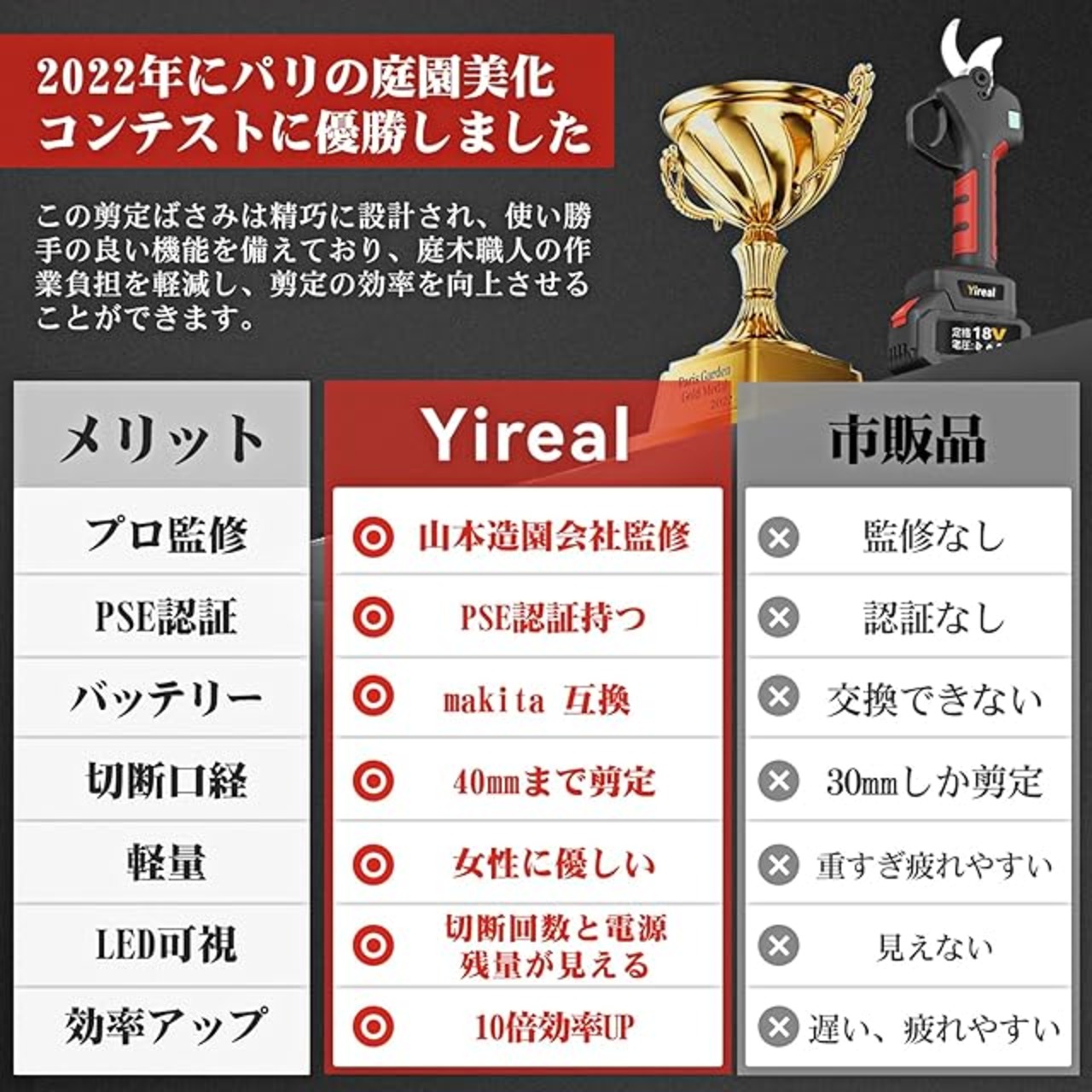 【40mm切断径&山本造園会社監修】Yirealの充電式剪定鋏はさいだい切断径40mmの枝を楽々に切れます。開き口は半開・全開の2段階に調節できる、半開なら小さな開口は作業時間と電力を節約し、全開なら太い枝を簡単に切れます。弊店の電動バサミは山本造園会社監修で植木屋さんが楽に剪定作業するために開発しました。この10年に世界中2万の造園会社に10万以上の植木屋さんが利用しています。
