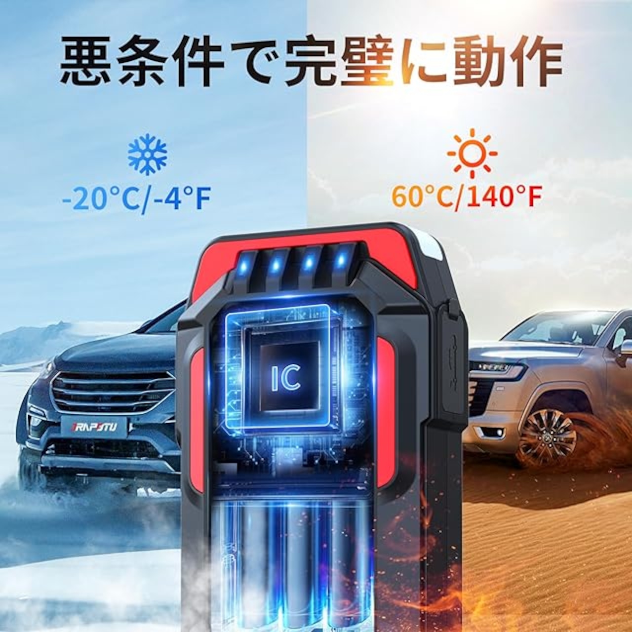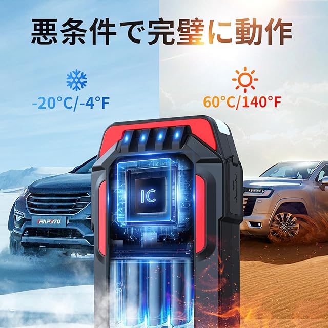 緊急起動:車のバッテリーが切れたら、このポータブルスターターを使用して車のバッテリーを素早く始動させます。3.5時間のフル充電で30回起動でき、ほこりや雨からの保護。