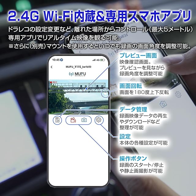 ドライブレコーダー 車 超軽量 コンパクト 簡単装着 配線不要 自動車 WiFi 200万画素 フロント リア オンダッシュ MUFU MF-BDVR003C