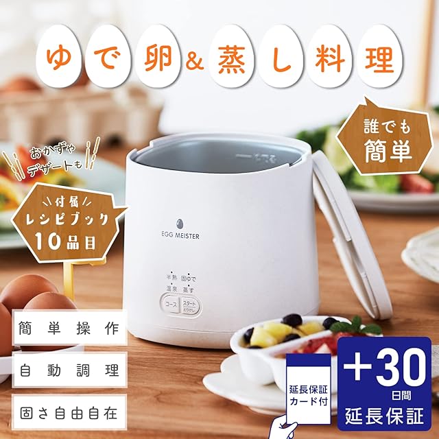 メニューは半熟/固ゆで/温泉/蒸すの4種類ございます。温度調節が難しい温泉卵までこの一台で簡単に作れます。また、付属のケースを使えば、茶碗蒸しやプリン、サラダチキンやガレットまで手づくり“蒸し料理”もできてしまいます。10品目掲載のレシピブックも付属しており、朝食やお弁当作りはもちろん、ダイエット食やおやつ作りなど幅広い料理をお楽しみください。