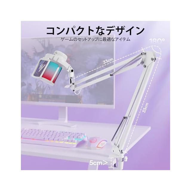 【コンパクトなデザイン-ゲームのセットアップに最適なアイテム】ツインアーム構造&強化クランプにより安定した設置環境を実現します。ショックマウントは振動ノイズを効果的に低減することができ、取り外し可能なポップフィルターは吹かれ音や破裂音といったポップノイズを防ぎ可能です。アームスタンドのカラーもマイクカラーに合わせてデザインされます。