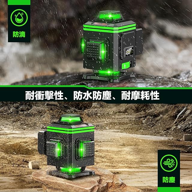 ✅【高精度・視認性の良い16ラインレーザー墨出し器】改良点❶:エレベーター三脚付属し、高さは3段階で伸縮ができます。ロータリーアダプター付き、三脚で180°傾斜使用可能です。レーザー水平器と一緒にケースを収納でき、持ち運びに大変に便利です。それにセットには1/4インチ変換ネジが付属、各種のレーザー墨出し器に取り付け可能です。改良点❷:電量LEDが搭載し、作業中バッテリーの残量が一目瞭然。改良点❸:レーザーの明るさが無段階調整できます。改良点❹:レーザー墨出し器本体のベースは360°回転できます。改良点❺:2x360°水平線と2x360°垂直線が部屋全体をカバーします。より精度・輝度が高いです。各ボタンは単一のレーザーラインに対応しており、任意のレーザーラインのオン/オフを簡単に選択できます。グリーンレーザーを採用していて、明るくクリアなグリーンレーザービームを照射し、簡単に正確な結果を得ることができます。レーザー基準:クラス2