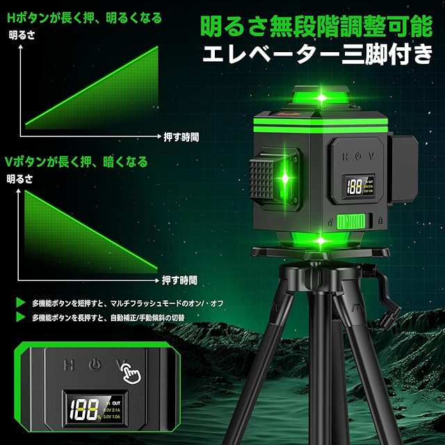 ✅【明るさ無段階調整可能&受光器対応】レーザー明るさ調節可能:Vボタンが長く押すと明るさが弱くなって、Hボタンが長く押すと明るさが強くなります。専用の受光器(別売り)と組み合わせて使用でき、室外50M~60M以内でも楽に作業できます。