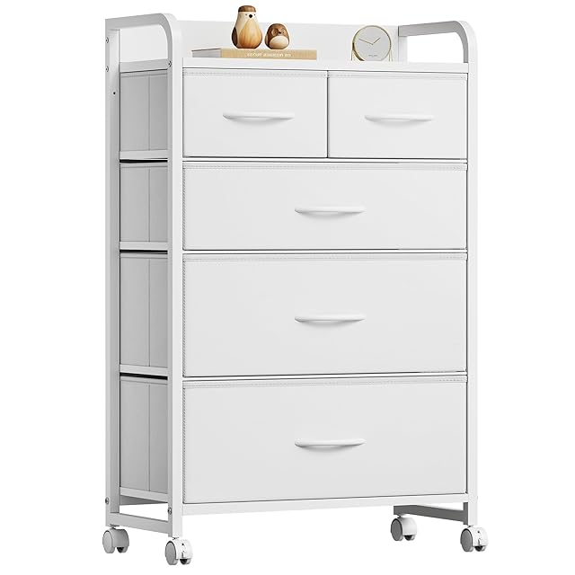 YeTom タンス 収納 收?? チェスト 洋服タンス ランドリーチェスト 脱衣所 収納 洋服収納 衣類収納 箪笥 リビング 収納 木製天板付き 和風 布製引き出し 転倒防止 安定感 ストッパー付きキャスター L55×W29×H96cm (4段5杯 白い)