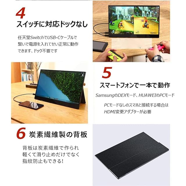 【多機種に対応】ノードパソコン、デスクトップ、スマホ、PS4、PS5、XBOX ONE、Wii又はNintendo Switchなどにも対応しています。USB Type-Cケーブル1つ或いはUSB Type-Cケーブル1つ+Mini HDMIケーブル1つの組み合わせでデバイスとモバイルディスプレイを接続でき、いつでも仕事用、プレゼンテーション、ゲームや映画などに使える最高の相棒になります。