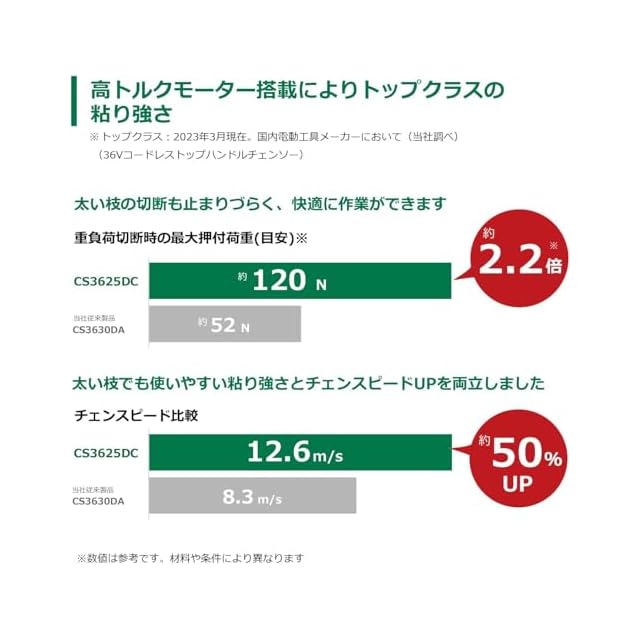 ハイパワーの高トルクモーター搭載によりトップクラス※の粘り強さ。太い枝でも使いやすい粘り強さとチェンスピードUPを両立。 ※2023年3月現在。国内電動工具メーカーにおいて(当社調べ)(36Vコードレストップハンドルチェンソー)
