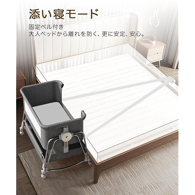 【高さ調節可能】高さ5段階調節可能で、添い寝として大人ベッドの高さ同じに調節でき、各高度の大人ベッドにくっつけてご利用可能です。両サイドの高さを調整して傾斜を作り出します、新生児に対してミルクの吐くことを防ぐことができます。キャスターにはブレーキが付いているので、ベビーベッドをいつでも固定できます。固定ベルト付き、大人ベッドから離れを防ぐ、くっつける可能、更に安定、安心。