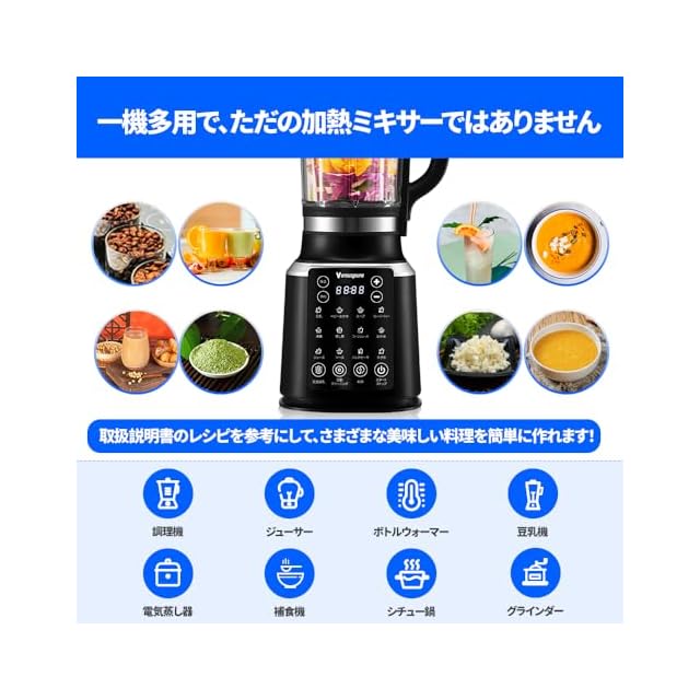 【強力な加熱機能と高効率モーター】加熱式ミキサーはアップグレードされた9シリーズは、高性能1200W高速モーターと800W加熱モーターを搭載、25000~60000RPMの高速回転により、氷やナッツなどの硬い食材も簡単に粉砕可能です。加熱機能により、ミルクプリンのような滑らかで繊細な食感を実現し、最短2分で美味しい食物を作ることができ、料理をより簡単で効率的にします。