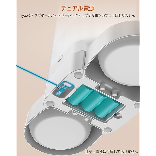 【2WAY給電・停電の心配なし】猫自動給餌器は電源アダプターから給電でき、単1形アルカリ乾電池3本(含まない)にも対応します。 バッテリーバックアップにより、家が停電しても猫えさやり器は動作します。 安全上の理由から、2 つの電源を同時に使用することをお勧めします。