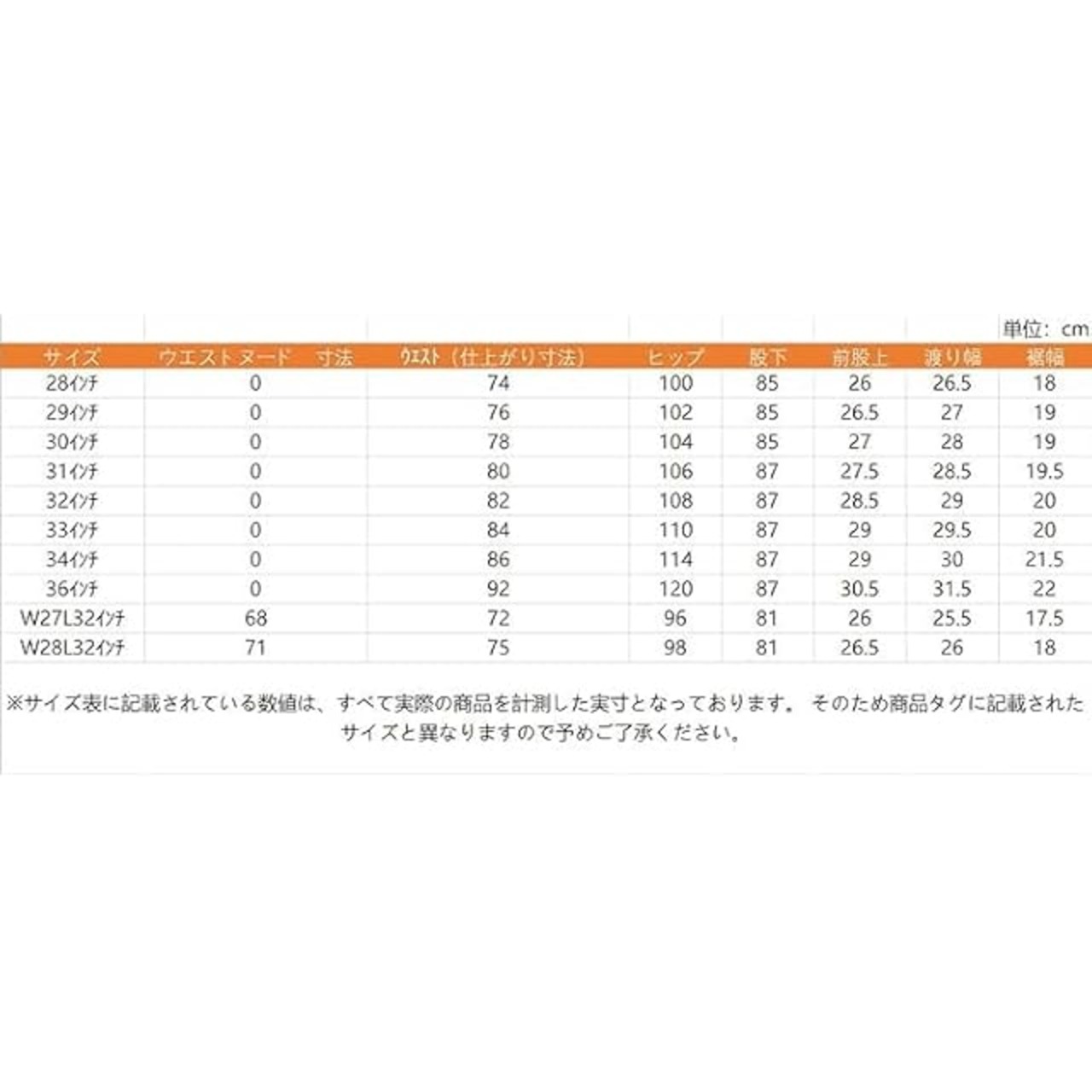 SIZE:W28L32インチ ウエスト:71cm ヒップ:72cm 股下:94cm 股上:81cm わたり幅:28cm 裾幅:30cm / SIZE:W29L32インチ ウエスト:73cm ヒップ:74cm 股下:96cm 股上:81cm わたり幅:29cm 裾幅:31cm / SIZE:W30L32インチ ウエスト:76cm ヒップ:78cm 股下:98cm 股上:81cm わたり幅:29.5cm 裾幅:31cm / SIZE:W31L32インチ ウエスト:78cm ヒップ:84cm 股下:100cm 股上:81cm わたり幅:31cm 裾幅:32.5cm / SIZE:W32L32インチ ウエスト:81cm ヒップ:86cm 股下:102cm 股上:81cm わたり幅:31cm 裾幅:32.5cm / SIZE:W33L32インチ ウエスト:83cm ヒップ:88cm 股下:104cm 股上:81cm わたり幅:31cm 裾幅:33.5cm / SIZE:W34L32インチ ウエスト:86cm ヒップ:90cm 股下:106cm 股上:81cm わたり幅:32cm 裾幅:34.5cm / SIZE:W36L32インチ ウエスト:91cm ヒップ:92cm 股下:113cm 股上:81cm わたり幅:33cm 裾幅:36cm / SIZE:W38L32インチ ウエスト:96cm ヒップ:106cm 股下:120cm 股上:81cm わたり幅:33cm 裾幅:36cm