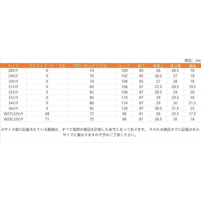 SIZE:W28L34インチ ウエスト:71cm ヒップ:79cm 股下:98cm 股上:86cm わたり幅:27cm 裾幅:55cm / SIZE:W29L34インチ ウエスト:73cm ヒップ:80cm 股下:100cm 股上:86cm わたり幅:28cm 裾幅:56cm / SIZE:W30L34インチ ウエスト:76cm ヒップ:83cm 股下:102cm 股上:86cm わたり幅:29cm 裾幅:57cm / SIZE:W31L34インチ ウエスト:78cm ヒップ:86cm 股下:104cm 股上:86cm わたり幅:29.5cm 裾幅:59cm / SIZE:W32L34インチ ウエスト:81cm ヒップ:89cm 股下:106cm 股上:86cm わたり幅:30cm 裾幅:61cm / SIZE:W33L34インチ ウエスト:83cm ヒップ:92cm 股下:108cm 股上:86cm わたり幅:31cm 裾幅:63cm / SIZE:W34L34インチ ウエスト:86cm ヒップ:94cm 股下:110cm 股上:86cm わたり幅:32cm 裾幅:66cm / SIZE:W36L34インチ ウエスト:91cm ヒップ:100cm 股下:115cm 股上:86cm わたり幅:33.5cm 裾幅:66cm / SIZE:W38L34インチ ウエスト:96cm ヒップ:103cm 股下:118cm 股上:86cm わたり幅:34cm 裾幅:68cm