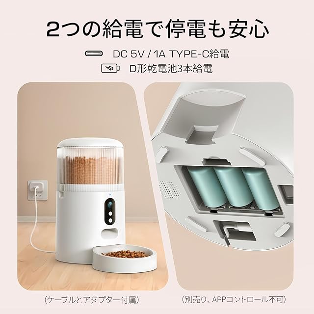 [大容量4Lとデュアル電源システム] 最大4L(約16.9カップ)のドライフードを収納でき、冷凍乾燥フードやエアドライフードにも対応しています。内蔵の乾燥剤バッグでフードの鮮度も保たれています。耐噛み性のUSBケーブルに加え、停電時にはD形乾電池給電3本(別途購入)がバックアップとして利用可能。この製品はネット接続が切断されても、停電でも自動給餌が継続します。