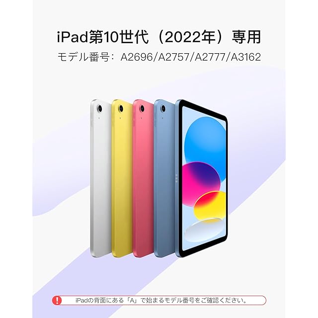互換性:このキーボード付きiPadケースは、2022年発売のiPad第10世代 10.9インチ (モデル番号: A2696/A2757/A2777/A3162) のみ対応しています。他のモデルには対応していません。ご購入前にお持ちのiPadの背面にある「A」で始まるモデル番号をご確認ください