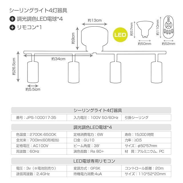 【器具+LED電球】 材質:アルミニウム。取付:引掛シーリング式。 器具はE11口金です。LED電球は700LM(調光可能) 、消費電力は6W 、色温度は2700-6500K(調色可能)です。
