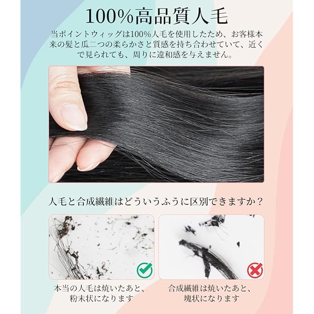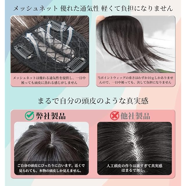 「髪の量を増やす・100%人毛」当ポイントウィッグは100%人毛を使用したため、お客様本来の髪と瓜二つの柔らかさと質感を持ち合わせていて、髪の量を増やす同時に違和感がなく、近くで見られても気づかれることがありません。 「抜群な固定力」人毛のため、本来の髪と同じように染めたり、切ったりすることもできます。ポイントウィッグの固定力が強いので、突然取れたりするようなことがありません、強い風でも問題ありません。