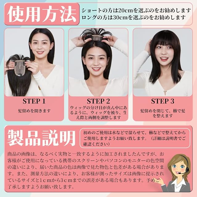 「ビッグサイズ」人工頭皮のサイズは10*11にも達したため、より範囲広く頭頂を覆うことができ、真上から見ても違和感がありません。 「毛は全て手植え」全てのウィッグの毛は経験豊富な職人が1本1本植え付けましたので、本来の髪と同じの立体感を感じられ、ぺちゃんこ髪になりません。 「広々とした可能性」当製品はポイントウィッグでサイド髪もありませんので、ポニーテールやツインテール、お団子ヘアにぴったりです。ぜひ、当ポイントウィッグをお試しください!