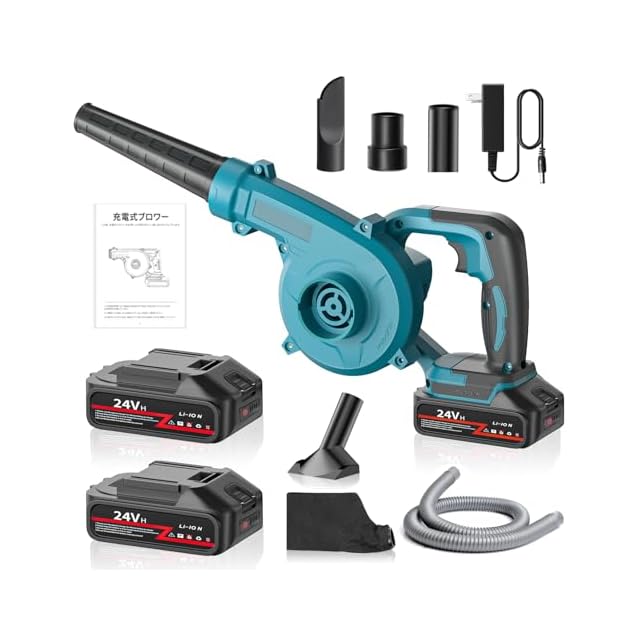 【2024新登場】ブロワー 充電式 ブロアー 【24Vバッテリ一2個搭載】 強力 電動ブロワー コードレス 1台2役 大風量 吹き飛ばし・集塵機能 風量調整 無断変速 大風量 回転速度:0-20000 r/min 軽量 コンパクト 落ち葉 車の水滴 庭掃除 急速充電器付き 日本語取扱説明書付き